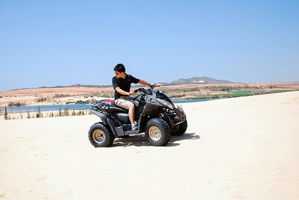Thuê mô tô 4 bánh vượt địa hình: Đến với khu đồi cát trắng, cách trung tâm Mũi Né khoảng 35 km, du khách sẽ có cơ hội cưỡi trên những chiếc mô tô địa hình 4 bánh, vượt qua những con dốc cát cao dựng đứng, du khách chỉ phải bỏ ra từ 600.000 đồng là có thể thỏa thích chinh phục những đồi cát trắng xóa như sa mạc ở Mũi Né.